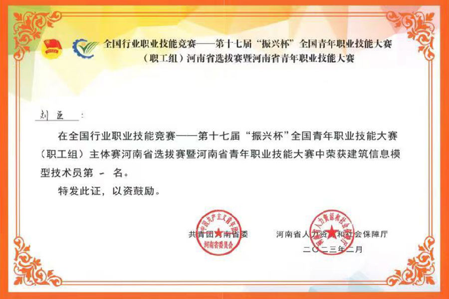 近日,公司華中分公司青年職工劉臣,在全國行業(yè)職業(yè)技能競賽——第十七屆振興杯全國青年職業(yè)技能大賽(職工組)主體賽河南省選拔賽暨河南省青年職業(yè)技能大賽中榮獲建筑信息模型技術(shù)員一等獎。