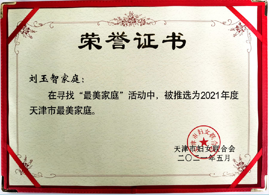 近日,從天津市婦女聯合會傳來喜訊,公司職工劉玉智、劉彪分別獲評2021 年度天津市家庭和睦“最美家庭”、紅色傳承“最美家庭”榮譽稱號,為公司贏得了榮譽。