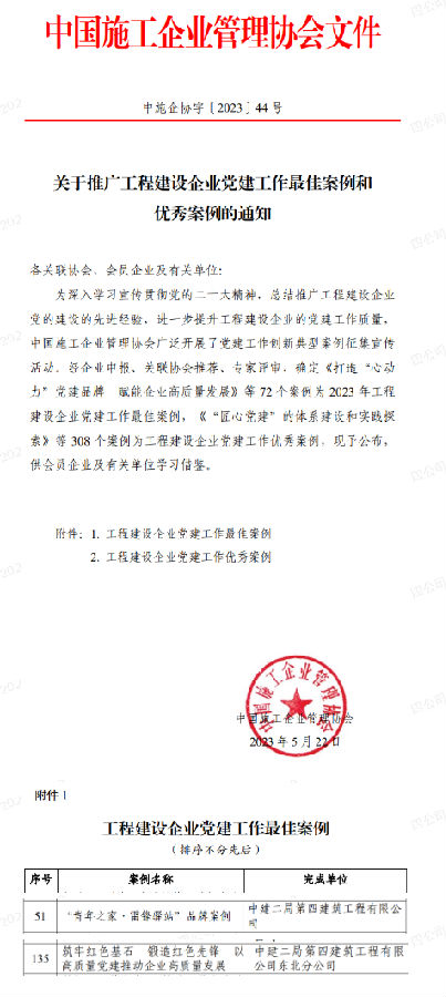 近日,中國施工企業管理協會印發了《關于推廣工程建設企業黨建工作最佳案例和優秀案例的通知》的通知,公司《“青年之家·雷鋒驛站”品牌案例》獲評工程建設企業黨建工作最佳案例,東北分公司《筑牢紅色基石 鍛造紅色先鋒 以高質量黨建推動企業高質量發展》獲評工程建設企業黨建工作優秀案例。